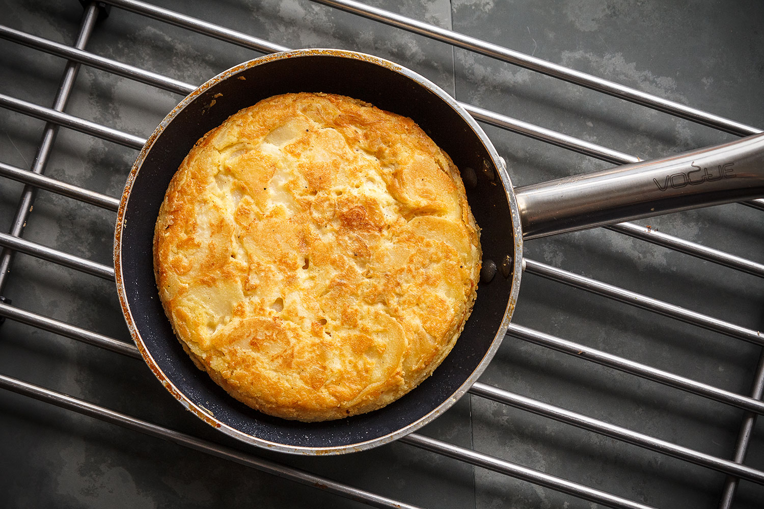 - When the tortilla is cooked through and set in the middle and on top, and the underside is golden brown, leave it to sit for 10 minutes to cool slightly and firm up to make it easier to turn over. To turn the tortilla, oil a large plate, place over the top of the frying pan, put your hand on top and gently turn the pan over, so the tortilla is turned over and on the plate.